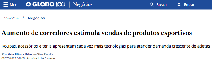 ✅Em 2024, a Track & Field (T&F) registrou aumento de 45% nas vendas de roupas e acessórios para corrida;
